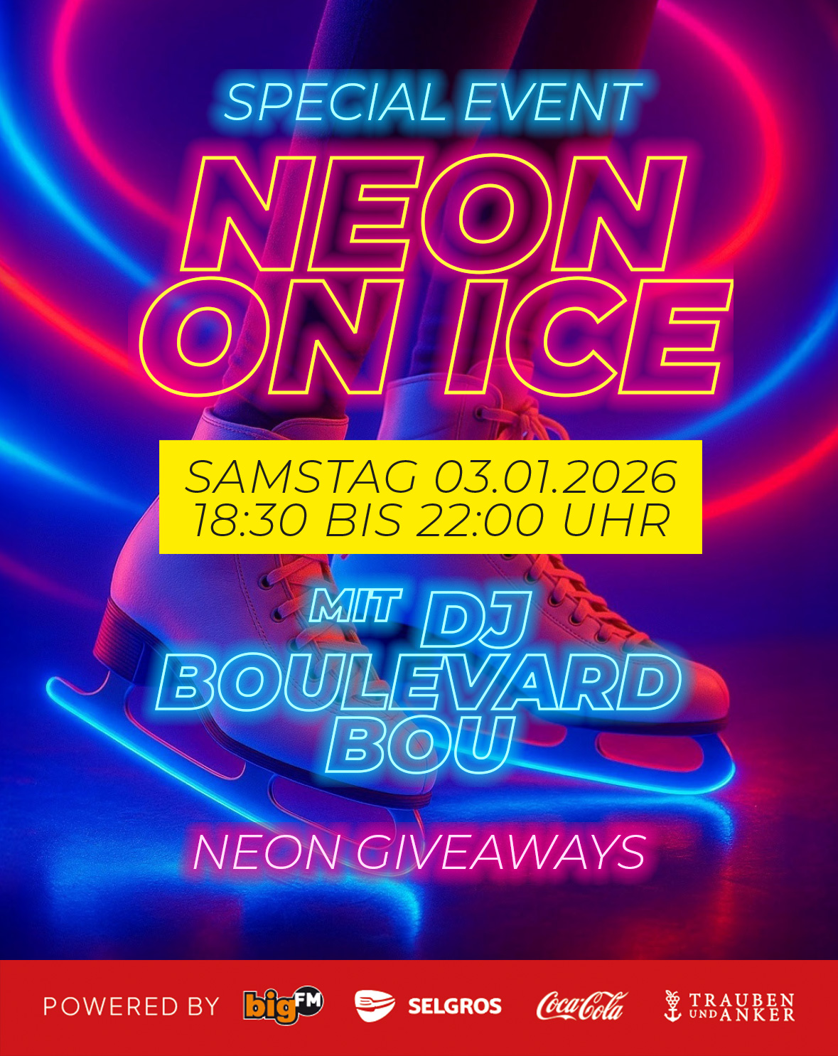 Ein besonderes Highlight: Jeden ersten Samstag im Monat steht kein Geringerer als bigFM DJ Boulevard Bou an den Turntables. Der Heidelberger Lokalmatador sorgt mit seiner energiegeladenen Mischung aus Chart-Hits, Hip-Hop, R’n’B und Club-Sounds für unvergessliche Abende auf dem Eis.