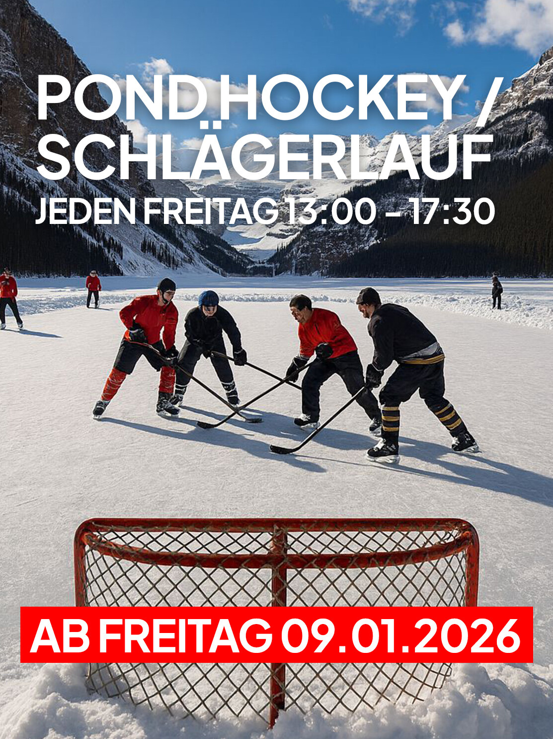 Jeden Freitag von 13:00 bis 17:30 Uhr gehört die Eisfläche den Hobbyspielern, Kreativen und allen, die Eishockey in seiner ursprünglichsten Form erleben möchten. Beim Pond Hockey spielt ihr frei, ohne festen Trainingsplan, ohne Druck und ohne feste Teams – ganz so, wie man es vom zugefrorenen See kennt. Der Fokus liegt auf Spaß, Bewegung und dem Gefühl, einfach nur Hockey zu spielen.